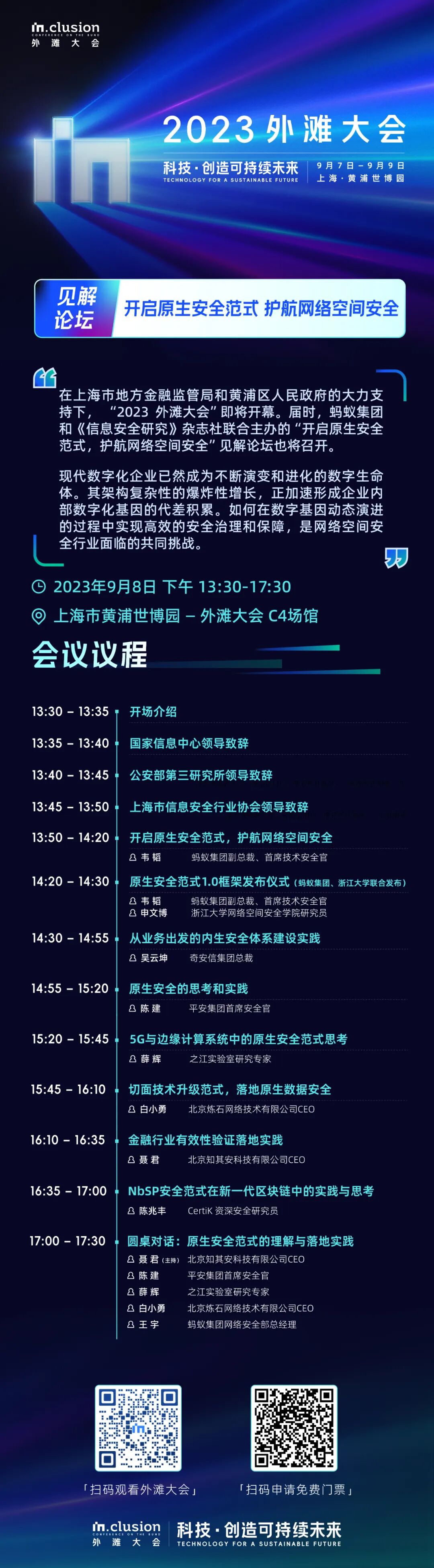 2023外滩大会将于9月7日在上海开幕。蚂蚁集团和《信息安全研究》杂志社联合主办的网络安全见解论坛也将于9月8日下午召开,以“开启原生安全范式,护航网络空间安全”为主题,聚焦“原生安全新范式”,共同探讨原生安全理念探索和实战分析,用创新理念与技术建设安全可持续的数字世界。