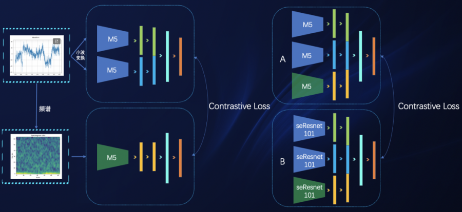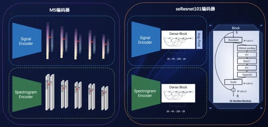 Encoder部分编码器设计,主要采用经典的M5网络和Resnet网络结构如图5所示,其中信号部分采用1维卷积核,来提取时域特征;频谱图采用2维卷积核,来提取频域特征。其中M5编码器属于浅层网络,采用5层的卷积和池化操作。而seResnet通过叠加不同层次的Dense Block模块,可以设计成深度网络结构。基于整个算法结构设计,编码器部分可以使用多种网络结构,包括Tranformer结构。