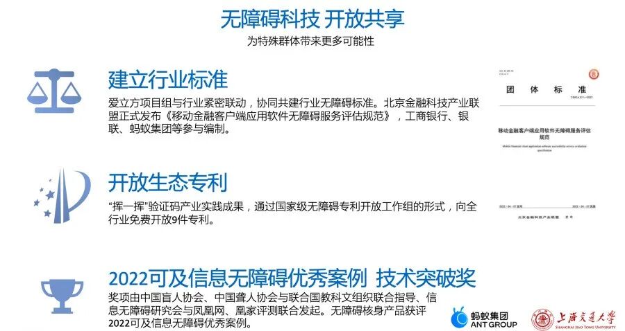 自2021年11月起,蚂蚁集团将“产学研用”有机结合,积极联动企业、高校等多方协同共建行业无障碍标准,并对外全面输出产业实践成果,免费开放无障碍安全科技全量专利。未来,蚂蚁将继续主动承担推动信息无障碍普及的企业责任,开发相关技术的同时持续拓展更多的应用场景,让温暖关爱实现从线上至线下的全方位覆盖,为更多群体带来顺畅的数字核身科技体验。