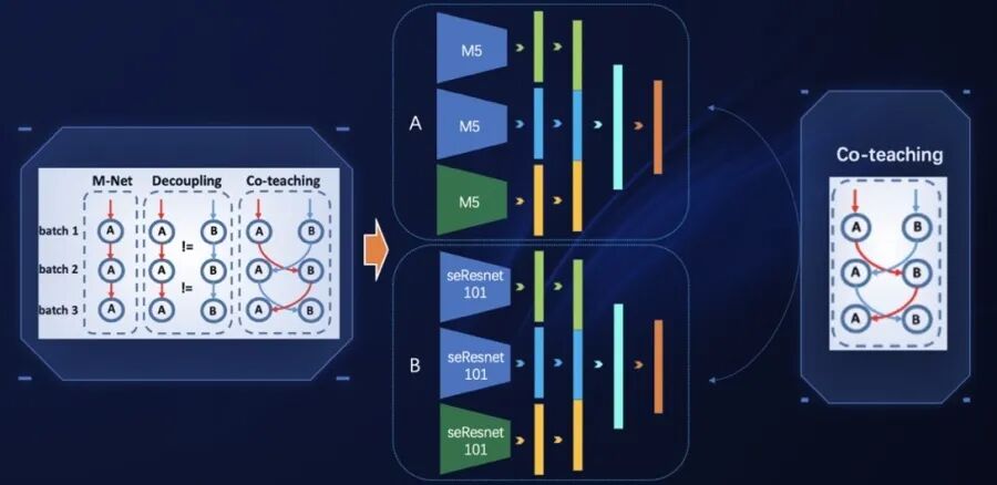 我们使用训练好的模型预测测试集,添加伪标签,选取可信度较高的样本加入训练集,再训练模型。由于在目标迁移时加入了伪标签,因此训练数据集中就存在错误的标签,这会导致网络学到错误的结果,因此我们使用Co-teaching方法,让M5和seResnet101相互学习,遗忘错误的标注,学到正确的结果。