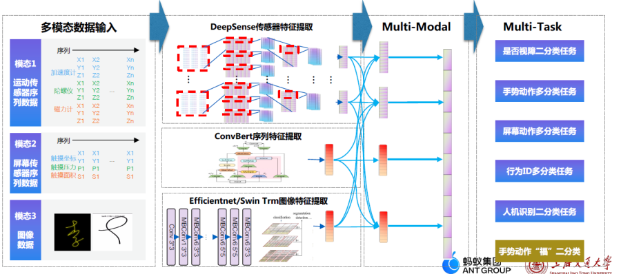 基于蚂蚁集团沉淀的可信AI技术能力和蚂蚁安全天玑实验室在生物识别安全和行为识别领域的多年积累,针对特殊群体身份识别的问题,我们提出了一种基于传感器的核身动作交互计算方案,通过对用户操作手机时传感器捕捉的数据,感知用户动作和身份,为多模态数据驱动的用户核身校验应用提供技术支撑。
