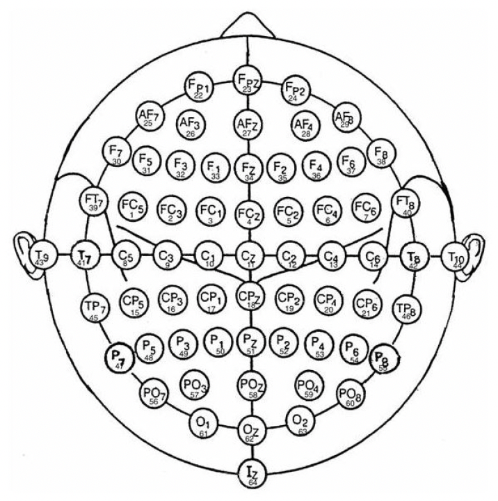 脑电信号数据集是研究脑纹技术的重要基础,而当前脑电信号数据的采集仍有很大的难度。目前大部分公开脑电信号数据集需通过无损伤电极帽采集。图1展示了64通道的电极帽平面图,该电极帽记录的脑电信号维度为64。目前常用的脑机接口范式包括运动想象、SSVEP、P300,不同的脑机接口范式对应着不同的脑电任务。