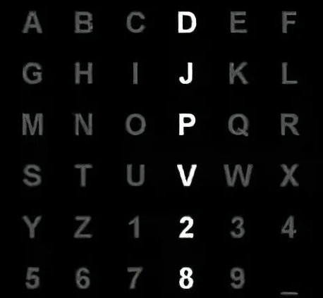 P300属于事件相关电位的一种,是一种内源性的、和认知功能相关的特殊诱发电位,主要位于中央皮层区域,当人体受到外界刺激后300ms左右会出现一个正向波峰。例如经典的P300视觉刺激的字符系统,该实验范式将36个字符排列成一个6*6的字符矩阵,并按照随机的次序闪烁矩阵中的某一行(或列),如图所示。为了拼写一个单词,受试者必须将注意力集中在矩阵中的字母上。只有当行(或列)包含了受试者选择的字母时,大脑才会产生明显的P300,因此能够推断出受试者选择的字母。