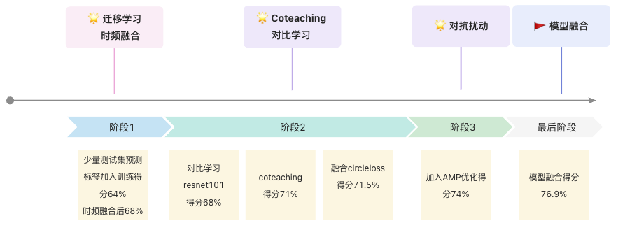 我们将提出的对比度量时频融合模型在公开的M3CV数据集上进行实验,准确率为68%,通过融入对比学习、度量学习和Co-teaching的训练策略,模型的准确率提升至71.5%;通过加入模型对抗扰动训练,模型的鲁棒性提升明显,准确率为74%;最终,我们通过模型加权融合策略将模型准确率提升至76.9%。