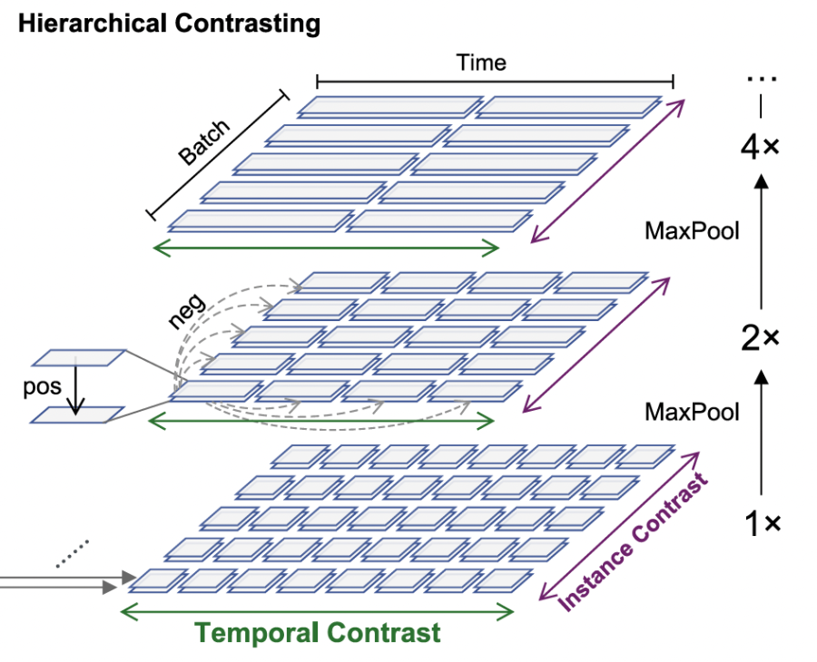 视障人群传感器数据量级较低,影响模型泛化性和鲁棒性。为解决该问题,我们首先在全部人群的传感器数据上应用基于对比学习的自监督方案,以对用户动作进行通用建模。特别地,在上述编码器获得的时序数据表示上我们应用通用的层次对比学习,以分别建模用户短期和长期动作特征。然后我们将模型在视障人群数据上进行迁移,使得模型在保持通用性的同时,适用于视障人群动作拟合。