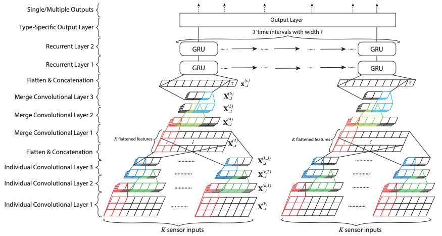 DeepSense时频网络,核心是卷积神经网络(CNN)和递归神经网络(RNN)的融合。首先输入序列数据会被分成一系列子序列,每个子序列的频率表示被输入到CNN中,以分层学习每个传感器数据内部的局部交互和不同传感器数据之间的局部和全局交互,然后将序列表示输入RNN学习时间顺序上的关系,从而得到最终的序列表示。