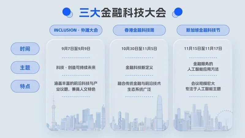香港金融科技周以广泛的生态系统著称,新加坡金融科技节以规模宏大闻名,上海外滩大会则以话题前瞻性与科技力量备受关注。这三场各具特色的会议将在9月至11月密集举办,成为这三大城市展示其实力的名片和舞台。