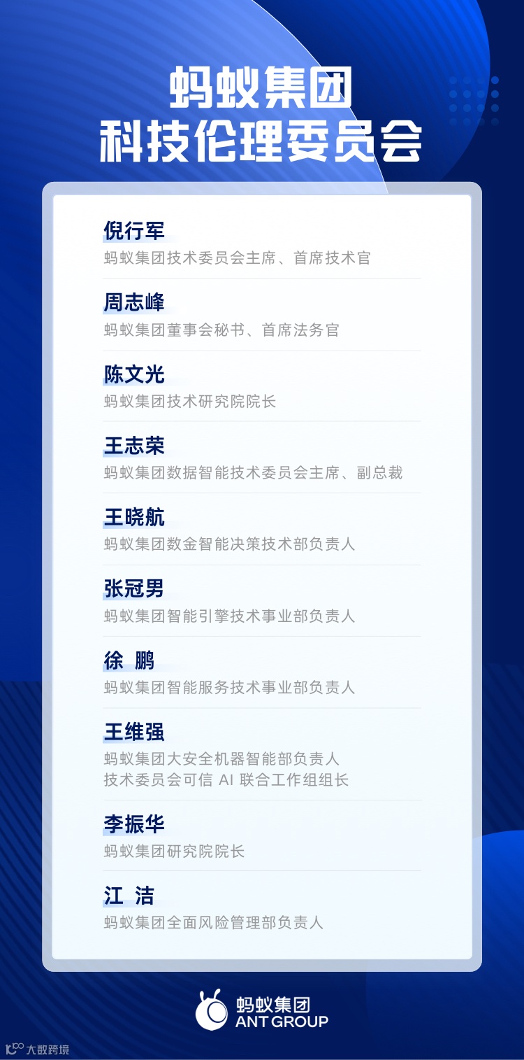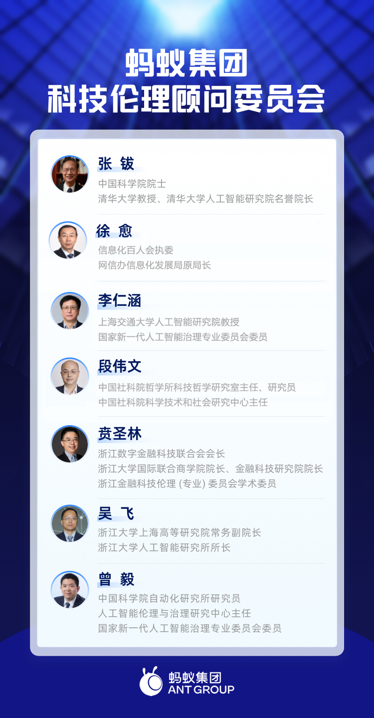 此前,蚂蚁集团已设立由首席技术官倪行军和首席法务官周志峰担任联席主席的科技伦理委员会,由技术团队、风险管理团队主要负责人组成,负责将科技伦理工作融入到公司业务和产品生命周期中,也将科技伦理意识融入到公司文化和员工习惯中。
