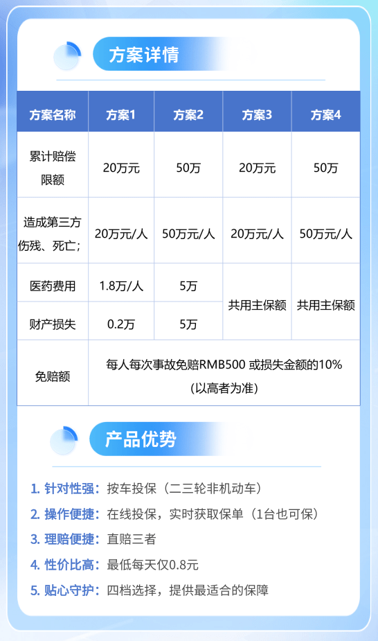 为满足广大客户的出行安全需求关切,骑士保特推出非机动车三者保险计划,保障实用全面、优势亮点突出。
