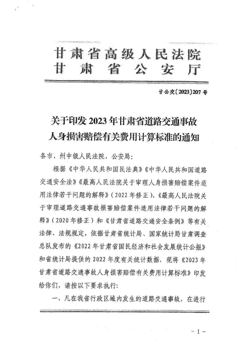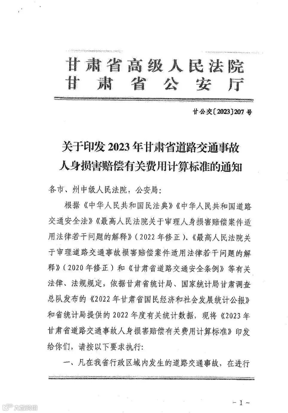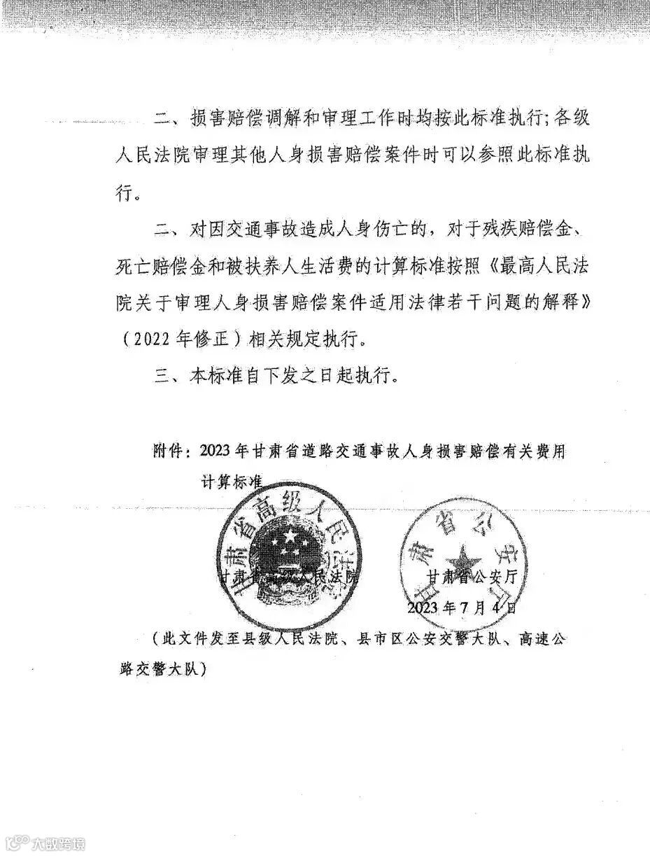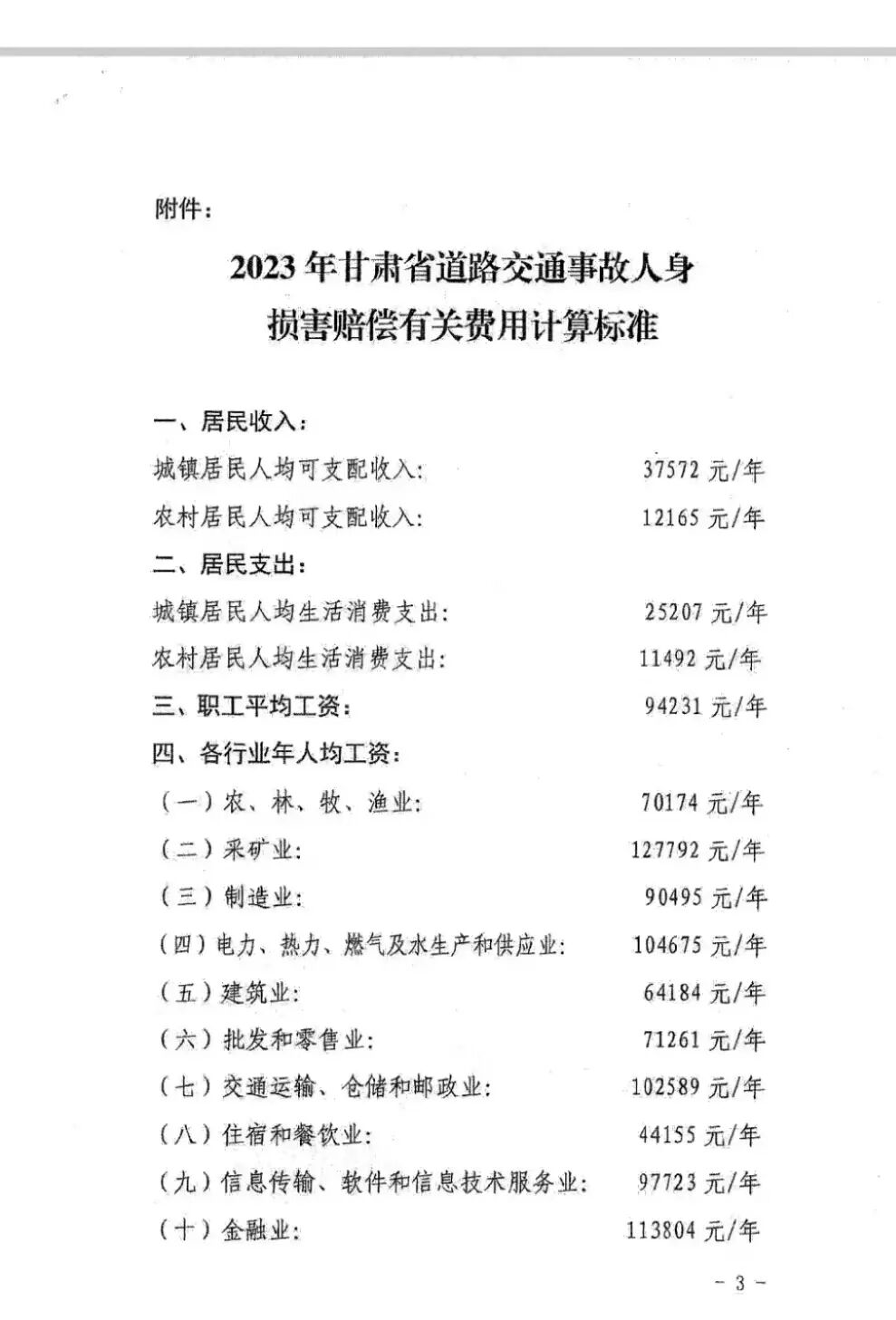 1、目前,甘肃省统计局已公布2022年度甘肃省城镇居民人均可支配收入及消费性支出数据。根据《最高人民法院关于审理人身损害赔偿案件适用法律若干问题的解释》(2022年修正)的规定,2023年甘肃地区人身损害纠纷案件中残疾赔偿金、死亡赔偿金均按照新标准37572元/年进行计算、被扶养人生活费均按照旧标准25207元/年进行计算。