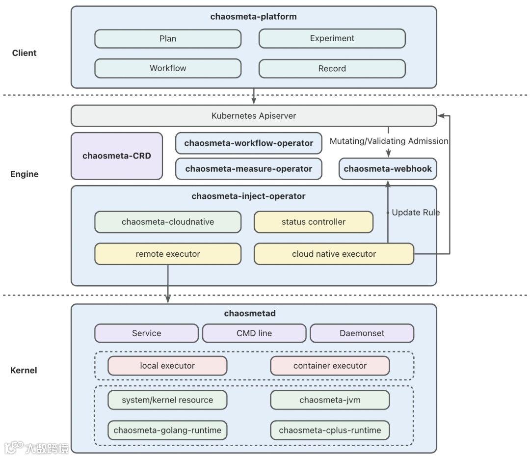ChaosMeta 的核心平台能力是基于 Operator 开发模式实现的,因此天然支持云原生。ChaosMeta 分为三层设计,详见官方文档: