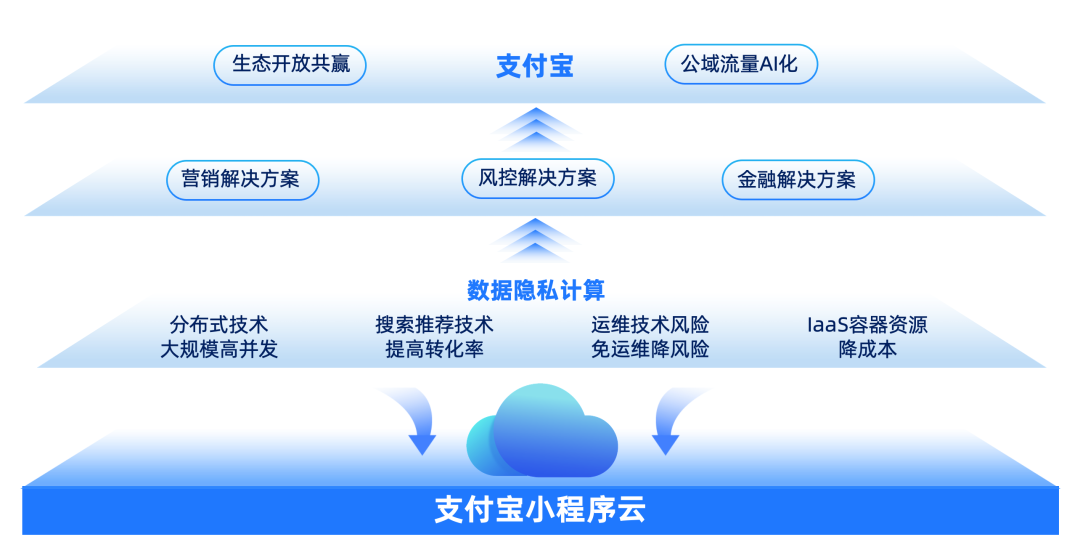 通过支付宝小程序云将蚂蚁集团内部业务领先的数据智能、隐私计算技术,结合公私域数据融合为商家提供更多数智化、场景化、精细化的营销解决方案,以及私域智能导购产品如智能搜索产品、个性化推荐产品、客户数据中心产品等助力商家降低获客成本、提升业务转化。