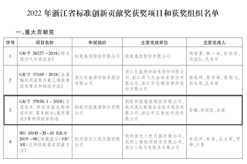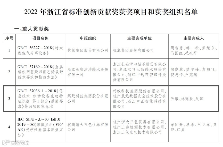蚂蚁集团等浙江省主要完成单位编制的关于“信息技术移动设备生物特征识别”系列标准项目获该荣誉最高奖项—“2022浙江省标准创新重大贡献奖”。