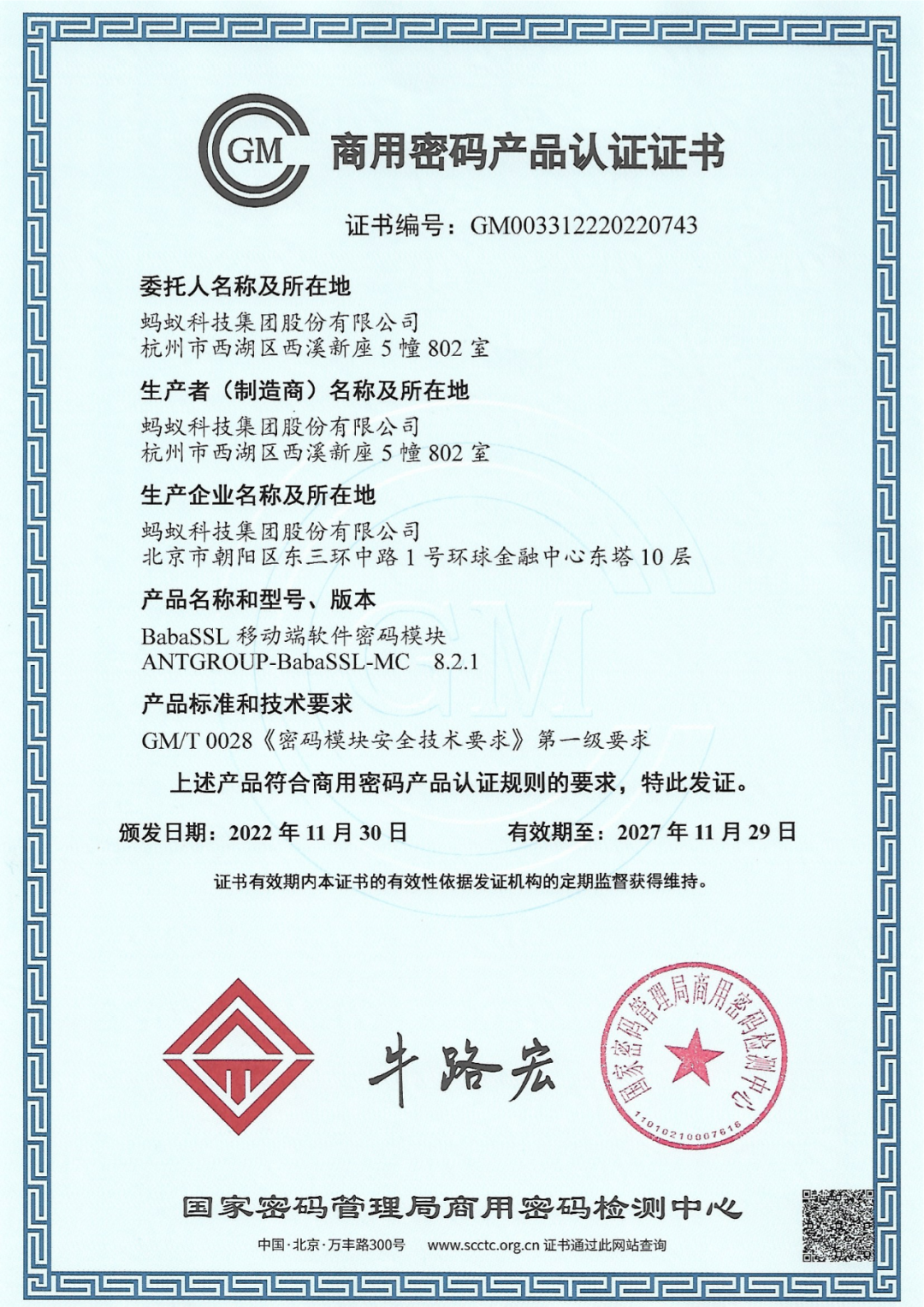 近日,蚂蚁集团自研的开源基础密码库“铜锁”正式获得国家密码管理局颁发的商用密码产品认证证书,成为全球首个通过商用密码产品认证的密码学开源项目。