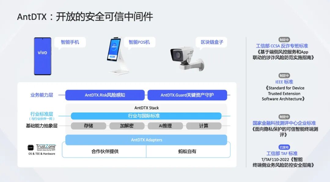 基于这套架构构建,AntDTX既能够解决像在智能POS机中的密钥与设备管理的合规问题,又能与手机合作伙伴一起在电诈等业务风控领域实现联合的治理,实现终端安全业务的统一。