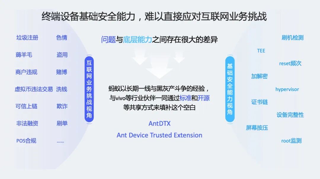为此,我们研发出AntDTX中间件,其全称为“Device Trusted Extension“,取义从设备提供的基础可信能力中向上扩展,来弥合基础系统安全能力与业务安全需求之间的空缺。这个中间件所涉及的接口、标准等,蚂蚁将与vivo在内的所有行业伙伴一同共建共享,也期待未来能通过开源等形式向行业进行开放。