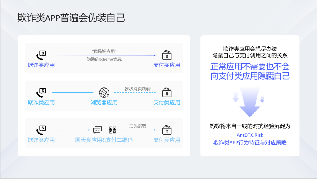 以上模式总结,均来自于和黑灰产的一线对抗经验,而AntDTX.Risk就是要把对这些模式的分析沉淀成电诈类APP的行为特征与对应策略,而且要保持与时俱进,紧跟最新的对抗形式。