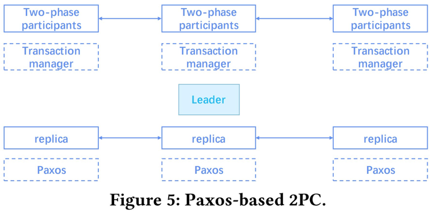 下图 5 为 Paxos + 2PC 概览,二阶段提交的每个参与者(participant)都包含了多个副本,并且它们可以通过 Paxos 协议轻松获得。当一个参与者节点出现故障时,Paxos 可以快速选出另一个副本来替代原先参与者以继续提供服务,并恢复原先参与者的状态,进而可以确定分布式事务的执行,并继续推进二阶段提交协议的完成。