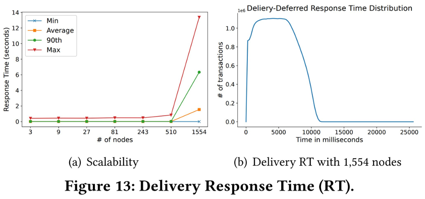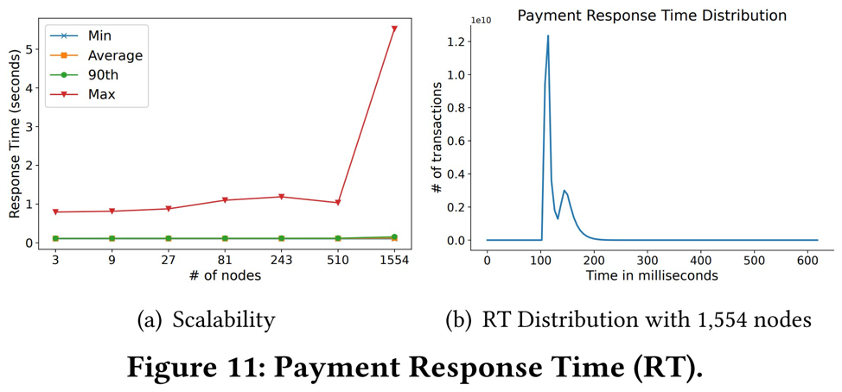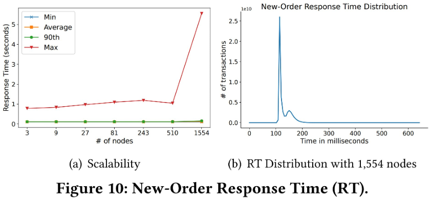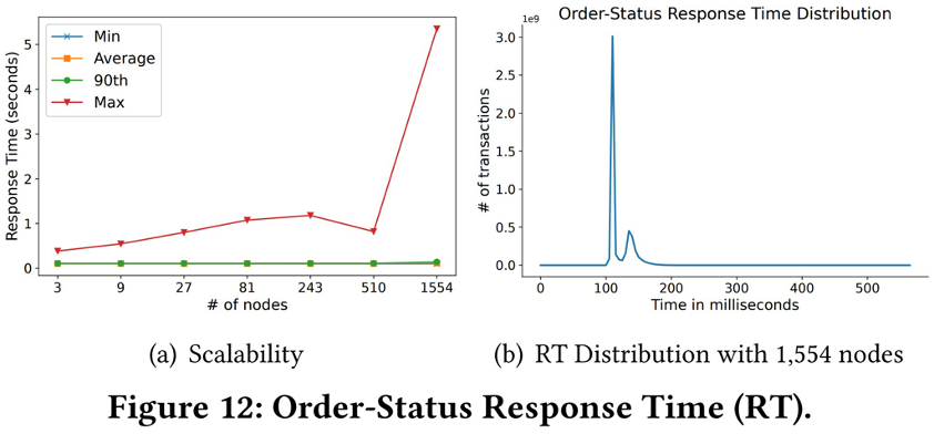 支付(Payment)响应时间如下图 11 所示。图 11(a) 报告支付事务类型的最小、平均、90% 和最大响应时间曲线图,前三项数值重合。最小平均响应时间为 110ms(3 个节点),最大平均响应时间为 123ms(1554个节点);最小 90% 响应时间为 114ms(3个节点),最大 90%响应时间为 154ms(1554个节点)。图 11(b) 展示了具有 1554 个节点的支付响应时间分布。