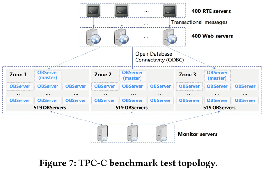 OceanBase 论文披露了第二次 TPC-C 基准测试的技术细节。拓扑结构如下图 7 所示,共部署 2360 台阿里云 ECS 服务器,并使用 400 台远程终端模拟器(remote terminal emulator,RTE)来模拟 559,440,000 个用户。同时部署 400 台网络服务器,每个网络服务器接收来自数个 RTE 的请求,通过 OceanBase 的 SQL 引擎将 TPC-C 事务实现为 SQL 存储过程,并通过开放式数据库连接(ODBC)调用数据服务器。