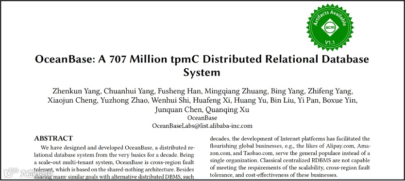 日前,OceanBase 研究成果论文《OceanBase: A 707 Million tpmC Distributed Relational Database System》,被数据库国际顶会 VLDB 2022 接收。VLDB 与SIGMOD、ICDE 并称为全球数据库三大学术顶会,收录研究机构以及工业界在数据库领域最前沿、最顶级的研究成果。