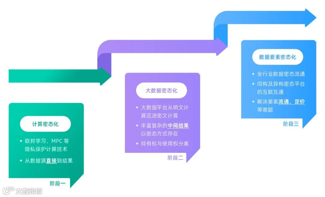 数据密态时代,每个阶段的技术要求和应用侧重不同,需要经历三个发展阶段,依次是:“计算密态化”、“大数据密态化”、“数据要素密态化”。