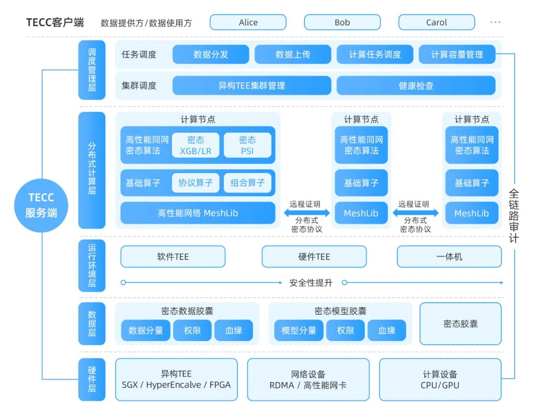TECC在架构设计上包含了参与方层、调度管理层、分布式计算层、运行环境层、数据层和硬件层。