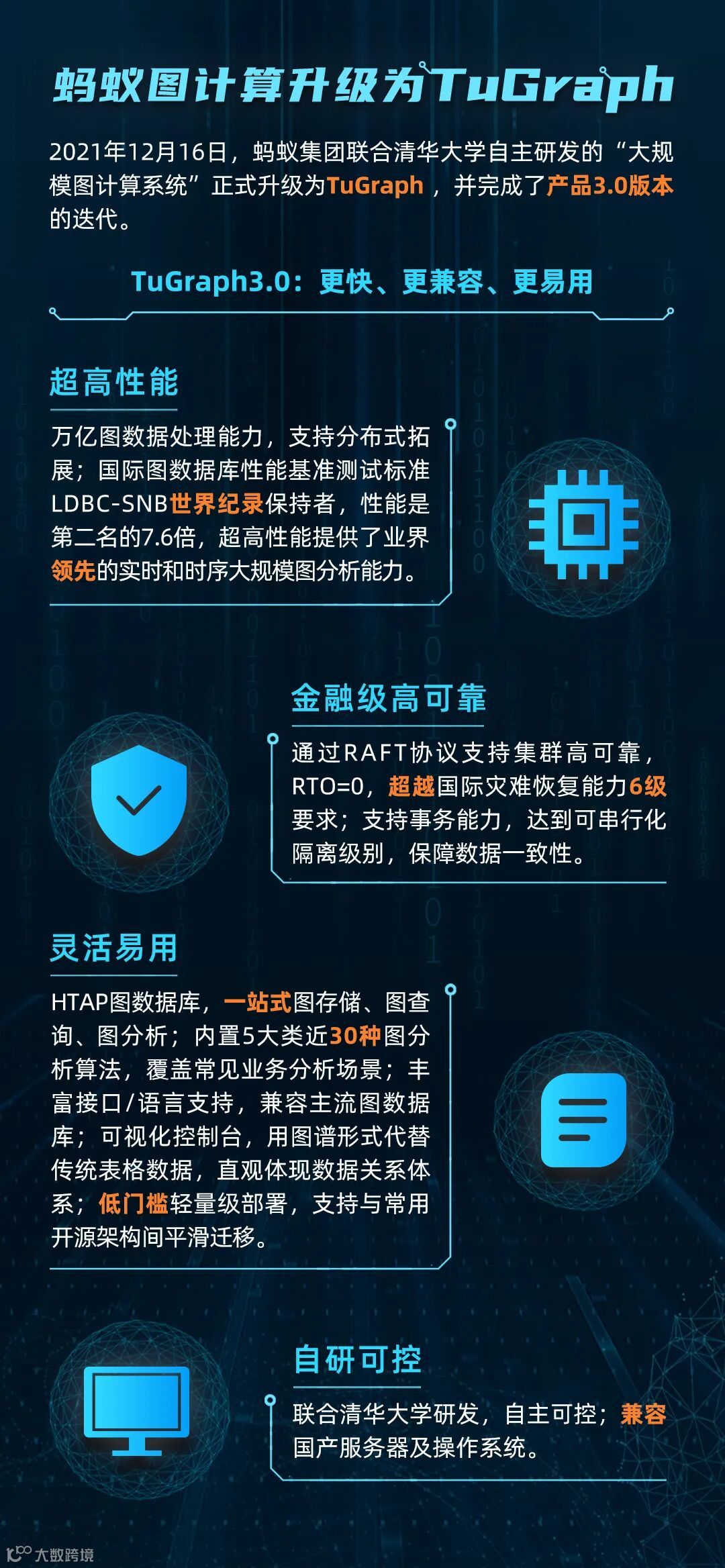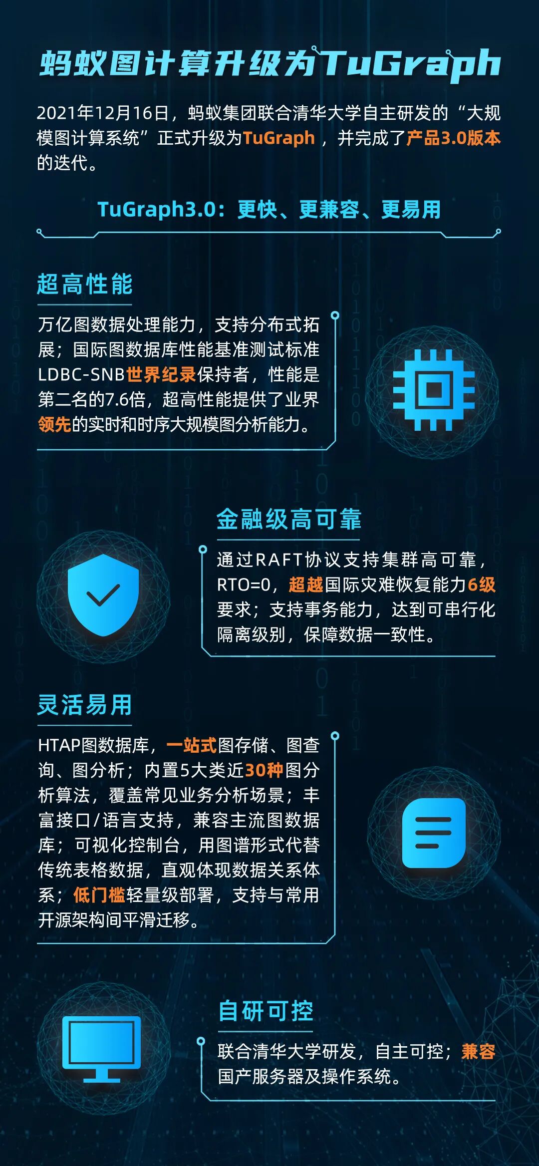 蚂蚁集团“大规模图计算系统GeaGraph”正式升级为TuGraph ,并完成了产品3.0版本的迭代。迭代后的版本查询效率提升10倍,兼容性更强。