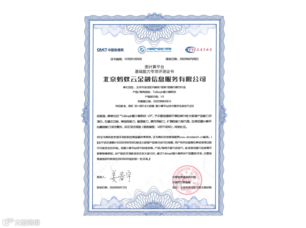 蚂蚁集团大规模图计算系统TuGraph,通过了“可信大数据”图计算平台基础能力专项评测,这是中国信通院首次针对图计算系统开展的“可信大数据”产品能力评测,TuGraph也成为首批通过该领域“可信大数据”评测的图计算平台。