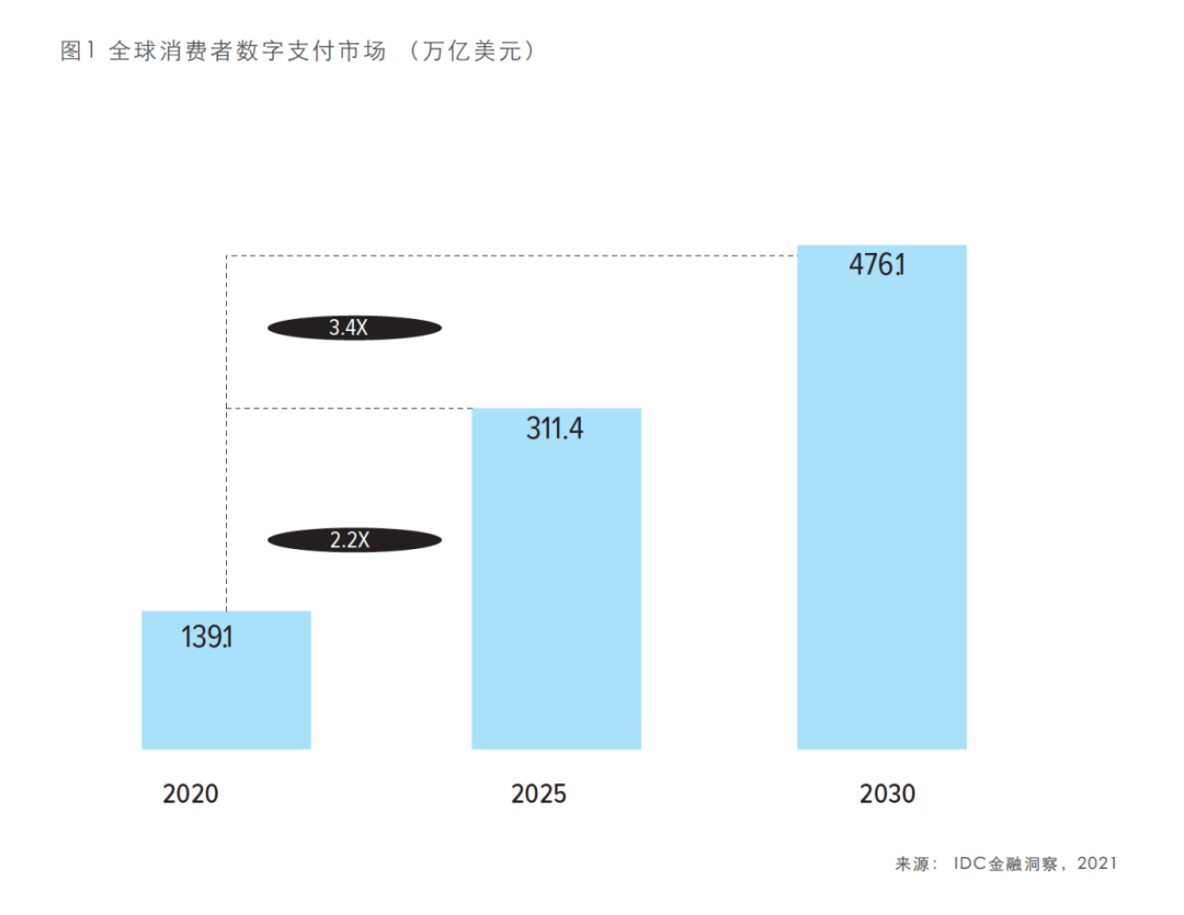 新冠疫情算得上数字化发展的一个“加速器”,但其实早在疫情出现之前,数字服务领域已经有了大规模的转型:从线上互动,到数字支付,再到依托于数字平台而生的新服务。疫情的出现加速了这一趋势,加速的势头预计将保持到2030年。图1数据显示,2020年到2025年,全球消费者数字支付市场预计增长2.2倍,而在2025到2030年期间,上涨幅度预计将进一步增至3.4倍。