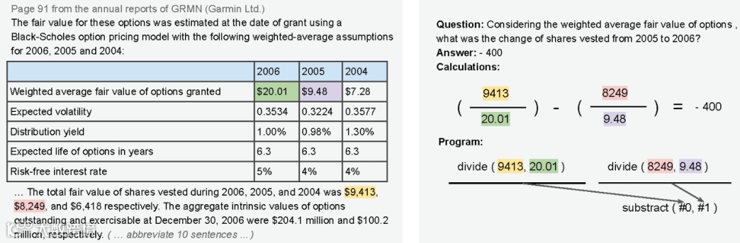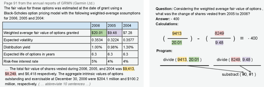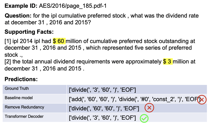 财务报表数量巨大,使得人们很难获取并分析公司的财务状况,对财报自动化分析并得到稳健的、可解释性强的数值推理面临着独特的挑战。FinQA论文为此提出了一个针对金融财报的数值推理问答数据集,数据集中包含异构的(表格和文字说明)公司财报,并招募专家编写关于数值推理的问答对,答案中既包含了计算结果,也有可解释的计算过程,可以点击此处查看数据样例。竞赛主办方根据上述数据集举办了FinQA竞赛,参赛选手需要训练模型预测计算过程与计算结果来回答针对公司财报提出的一些需要数值推理计算的问题。