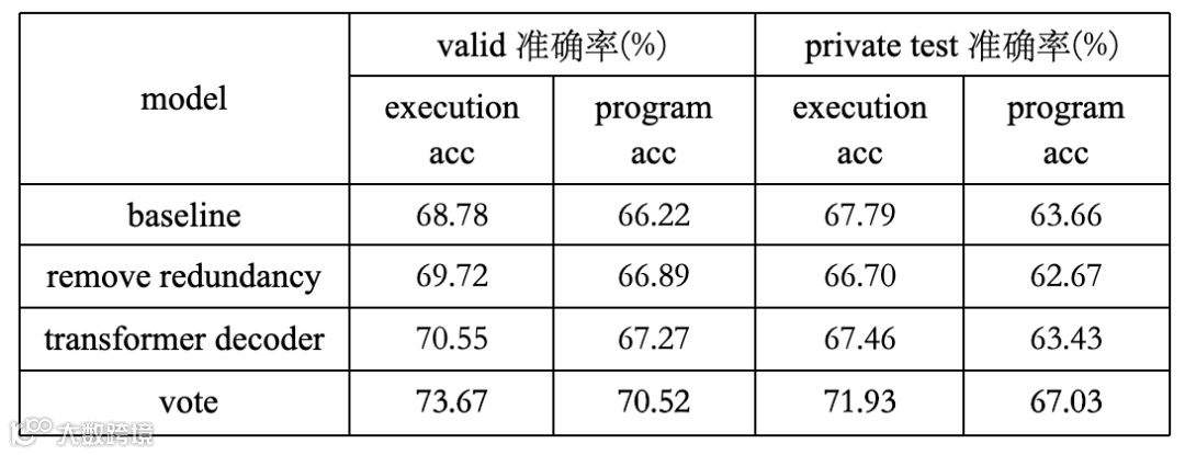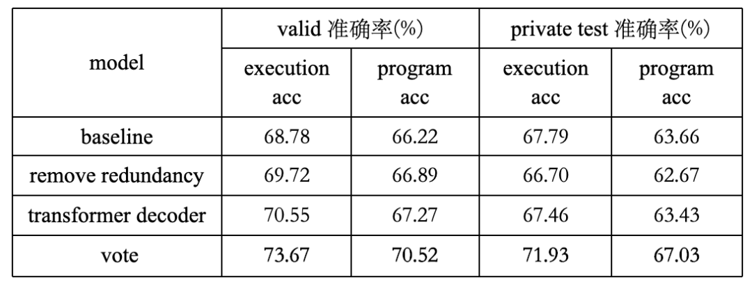 program generator采取投票(vote)的方式做集成,每个模型使用其在private test上得到的execution accuracy作为投票权重。program generator的投票方式有两种:对整个program投票、对每个program的每一步step投票。经过实验对比,我们最终选择了对整个program投票的方式。