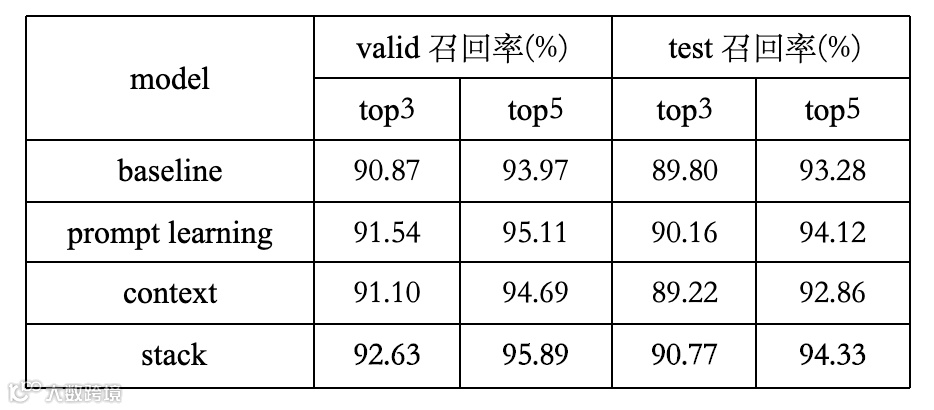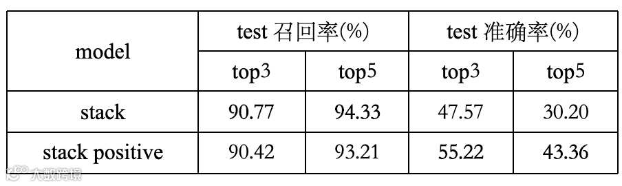 stack由3个模型集成得到,使用全部文本数据训练分类器,根据分类器预测的分数召回固定top k个高分文本;stack positive正负样本采样比例2:1训练分类器,根据分类器预测的类别最多召回top k个文本。第二个表格统计了stack与stack positive在test上的召回率与预测准确率,stack positive相比于stack以召回率的下降为代价召回更少的文本。