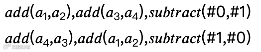 代码中使用sympy包的simplify函数判断两个数学符号表达式是否相等,因此如下的两个program是相等的: