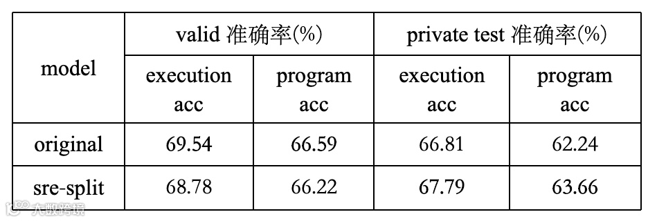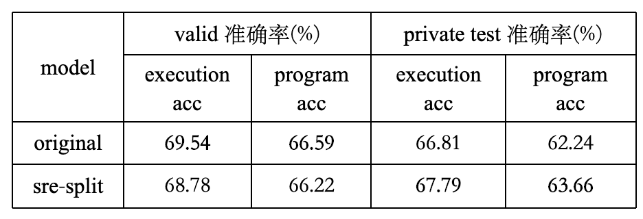 从表中可以看到,对整个program投票的方式相对于单模型可以提升4.14%的execution accuracy和3.37%的program accuracy。上表中三个单模型的结果均基于stack生成的数据,但vote模型基于多个以stack或stack positive生成的数据训练的program generator模型。