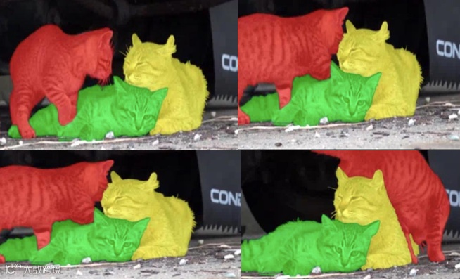 此外,以宠物险为例,除了利用鼻纹识别技术识别宠物之外,如下面视频中的四张图(图2)所示,算法模型可以将相互遮挡的三只猫体准确分割,从而进行就更精准的动物身份识别。