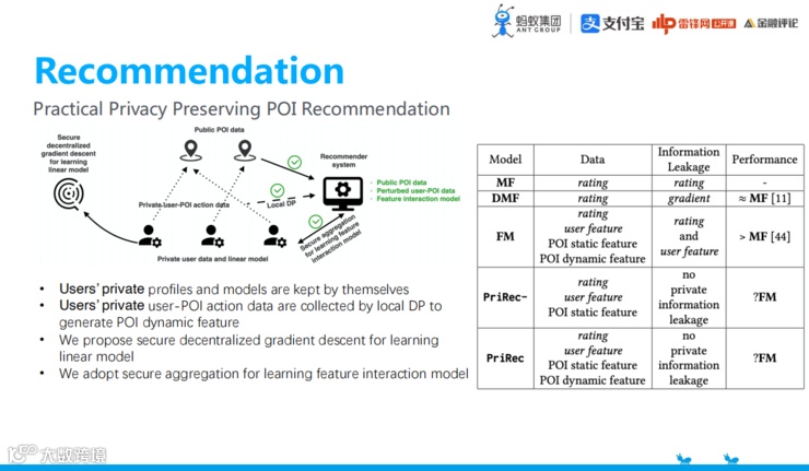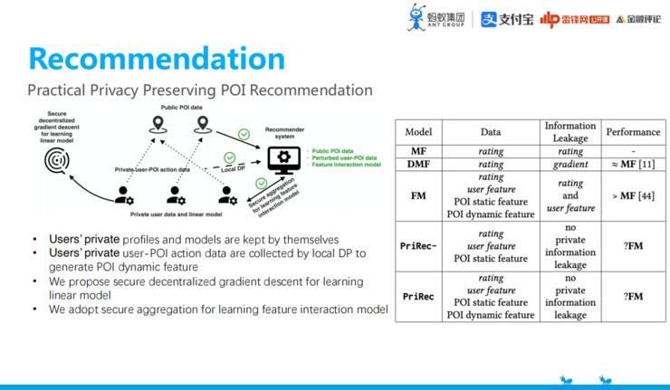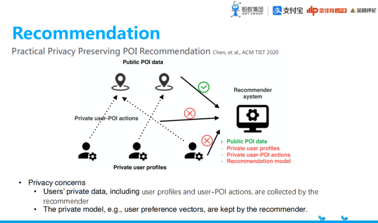 原来的做法,不论是非常详细的profile数据,还是一些用户跟POI的交互数据,用户的所有相关数据都要被推荐系统所收集。一些隐私模型,比如用户偏好也都是被推荐系统所保留。所以推荐系统有很大的机会窥探到用户相关隐私。