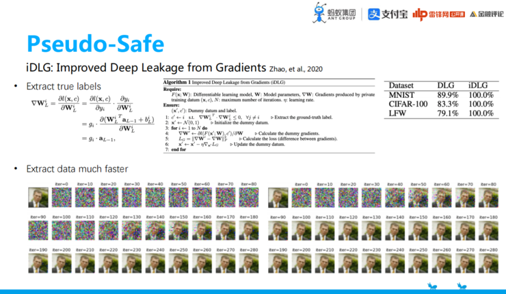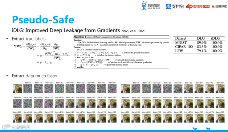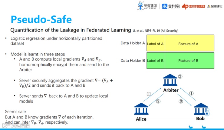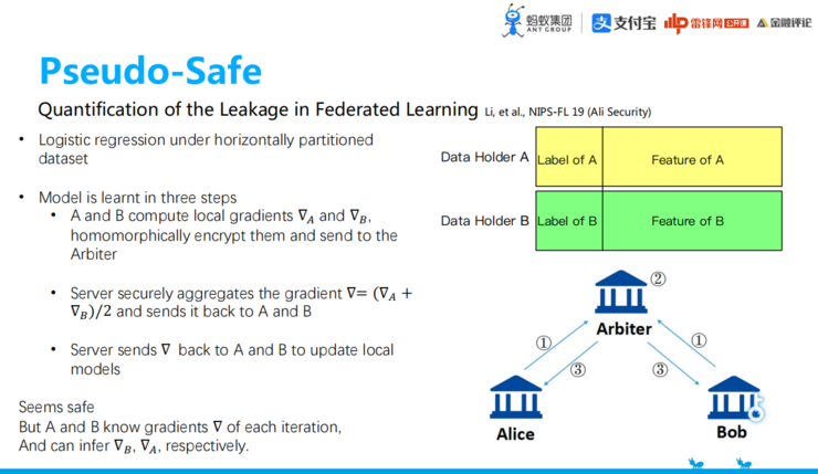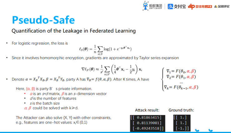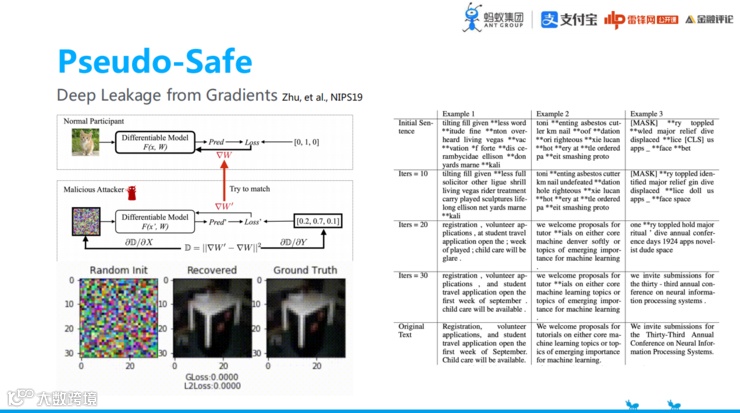 从学术上能够看到,在这种协同学习中,以前大家认为安全的共享梯度方式,本身并不是很安全,我们给它取了一个标题叫做非可证安全。