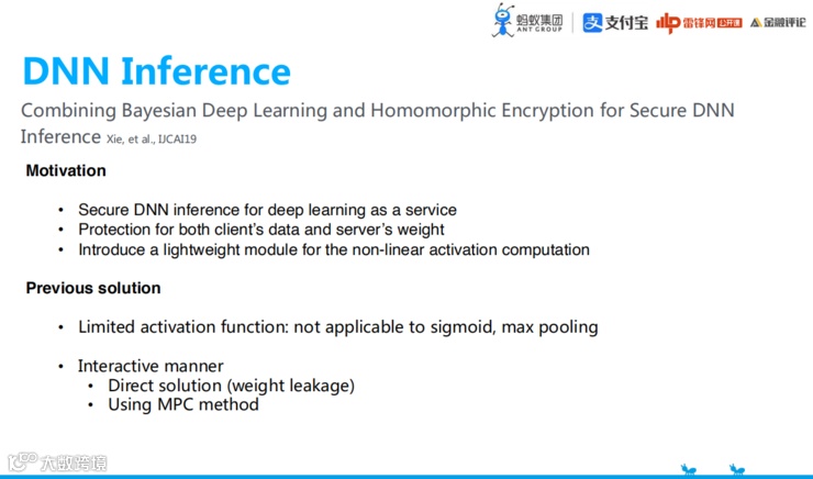 在模型训练上,涉及到前向、反向的计算,非常耗资源,它跟现有的一些隐私计算技术结合之后,对效率本身还是有比较大的影响。所以有很多工作都在考虑怎么做模型推理。在模型预测时,既要保护云上的模型,也要保护客户手里的数据。