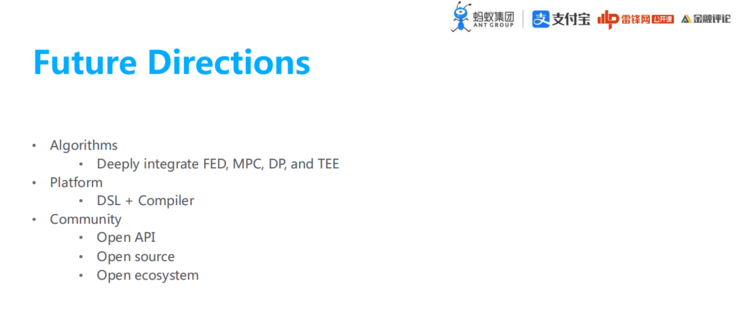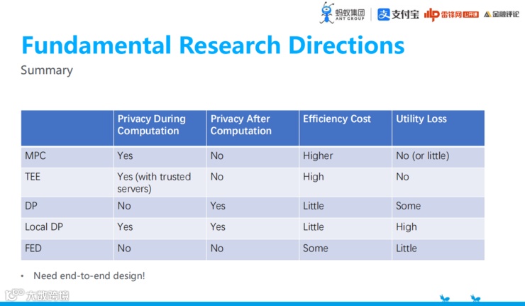 目前看来,现在这几个技术之间彼此有互补,但端到端的系统怎么在各个环节去利用合适的技术,去产生合适的效果?怎么样把这样一个系统在超大规模的数据上做相应的实践?在不影响效率的情况下,将隐私保护的等级能够升级到更高的级别?
