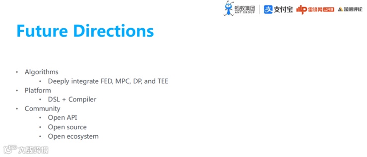 同时也需要整个AI圈子加上密码学的硬件再加上工程系统,一起努力才有可能在一些点上面取得真正的大的突破,才有可能使得整个隐私计算的效率能够再提升1~2个数量级。