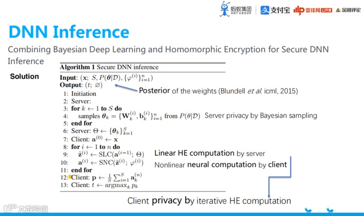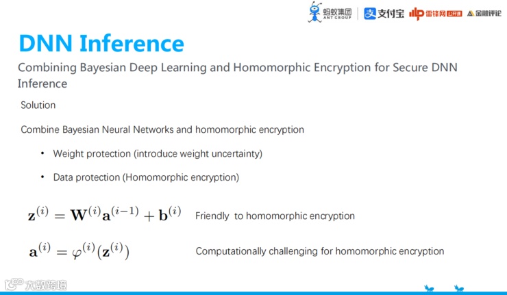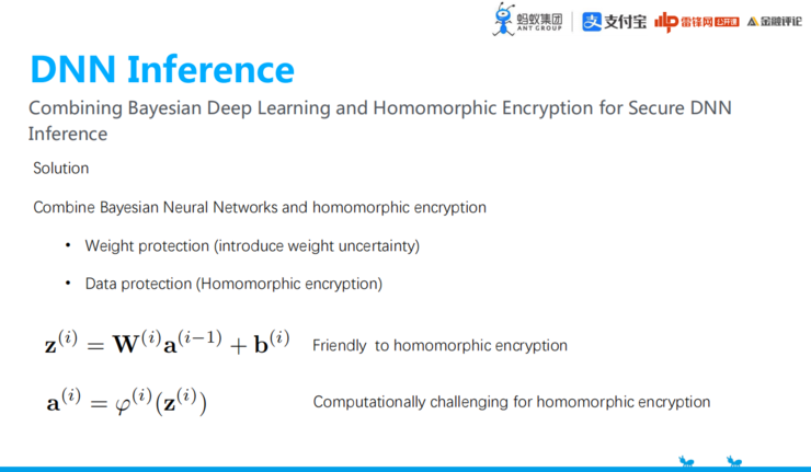 具体是把DNN的计算拆分成两级,一是首先通过采样的方法拿到W,有了W之后,客户端传过来的加密Input,通过线下的运算出Z,这也是密态的。密态下的Z在返回到客户端解密后,在客户端上就能拿到最后的a。