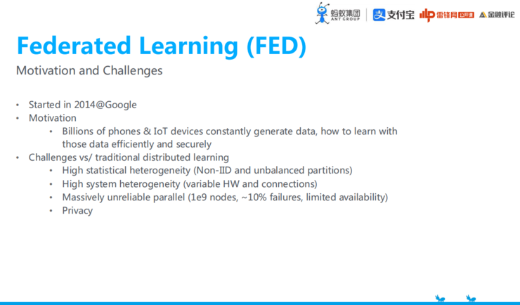联邦学习,谷歌在2014年就已经在内部开始做这样的技术,它本身是解决to C的问题,所以想解决几十亿的设备间如何协同、安全地利用数据训练模型。
