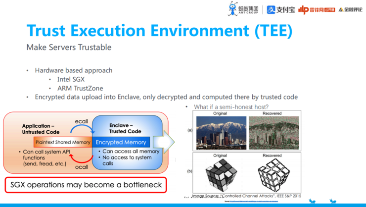 TEE里也有很多技术要去突破,比如目前TEE的内存只有128兆,相比普通系统还是比较小的。现在数据量比较大,尤其是在一个图像数据上,怎么在这么大的数据情况下完成隐私计算,是难度比较大的一个问题。