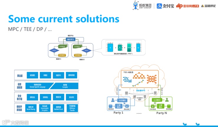 第一,从算法维度看,无论是在学术界还是工业界,目前的这几个方法割裂程度比较明显。比如TEE跟差分隐私,虽然他们之间有交集但并不多。