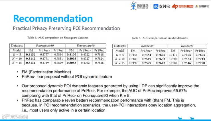 我们在两个数据集上做了比较,在Foursquare数据上,因为用户特征只有两三个,我们的方法比FM稍弱;但切换到真实的场景数据,因为这里面有大量的用户和POI数据,能看到我们这个方法比FM起到更好的效果。