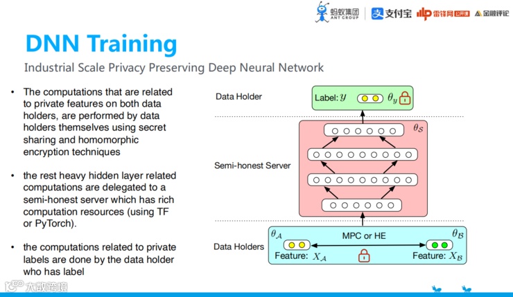首先,为了考虑特征之间的相关性,我们在底层利用MPC技术去做跟隐私数据相关的一部分模型计算。计算完之后,再把跟隐层相关的复杂计算,放到一个Semi-honest 服务器(半诚实服务器)去完成其他运算。