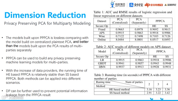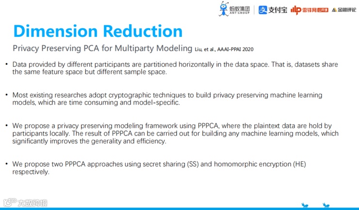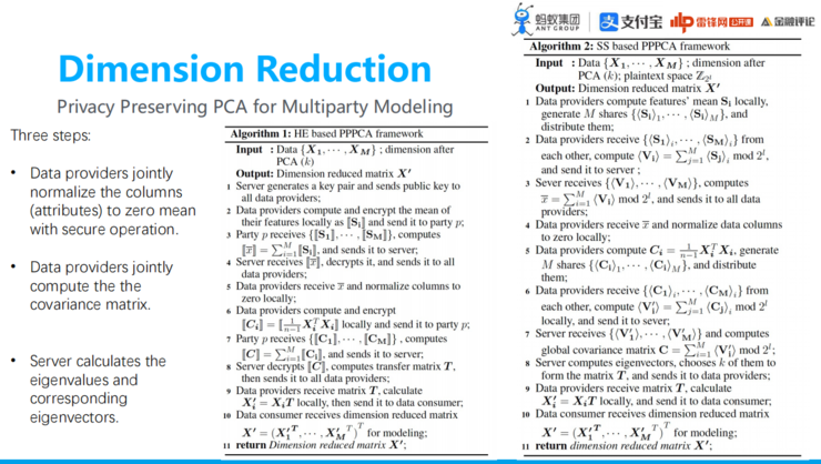 其次是计算协方差矩阵,最后再算出相应的特征值、特征向量,就得到了降维后的X′。同态加密和秘密分享的技术,跟PCA做相应结合,就能比较好的拿到相应结果。