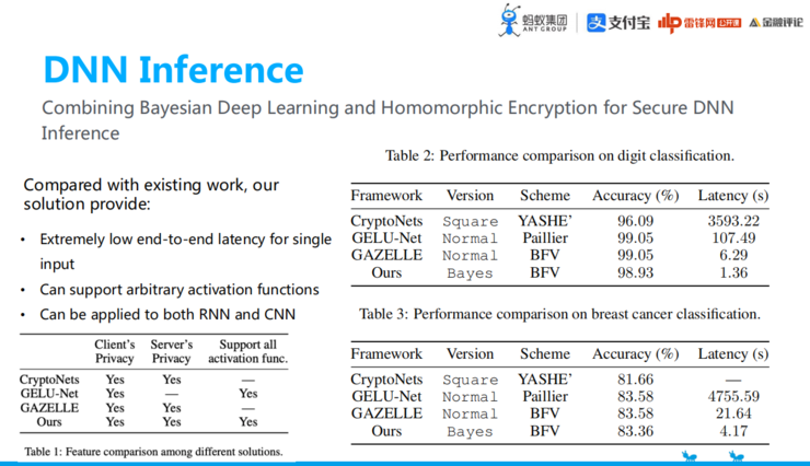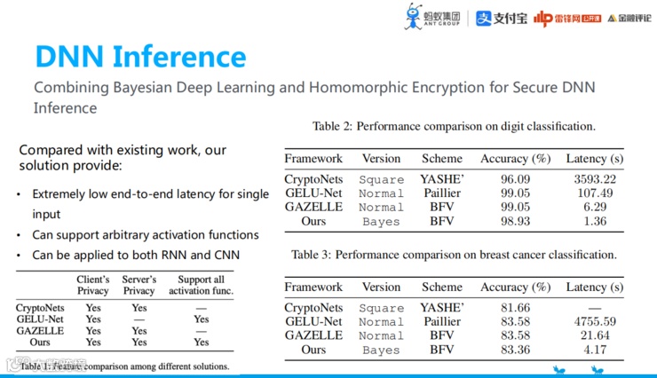 我们的方法,因为大量的复杂运算很多是返回到客户端上面,在非密态的情况下进行计算,所以Latency比较低。它还能支持任意的激活函数,可以比较好地扩展到RNN和CNN。