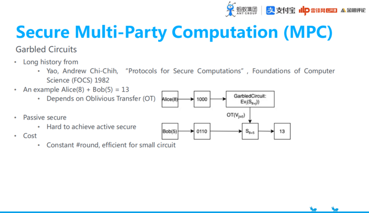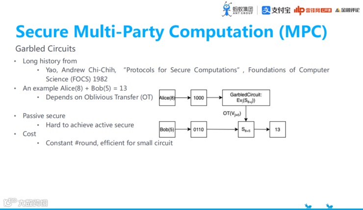 二是姚期智院士在1989年提出来的混淆电路。它主要是通过两个大的building block构建,一个是混淆的真值表,一个是遗忘传输,通过这两种方式完成协同计算,解决了著名的百万富翁问题。